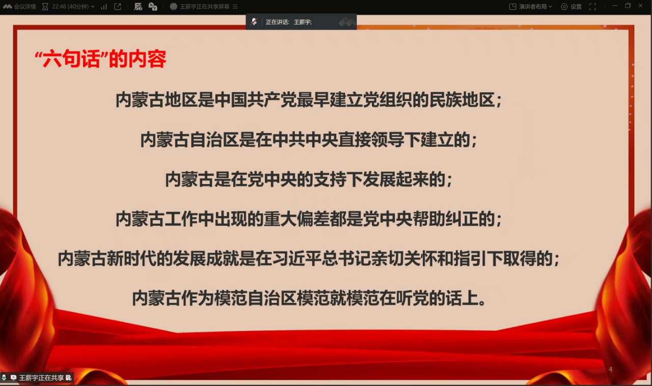4月29日,学生第五党支部通过线上线下相结合的方式开展专题党课,党支部书记王薪宇同志围绕“学习贯彻习近平总书记在内蒙古考察时的重要讲话精神”讲授党课,带领全体党员深入学习领会“六句话”的核心要义。通过回顾内蒙古革命的红色起点,把握内蒙古从革命斗争到建设发展,再到新时代全方位发展的历史脉络,进而感悟党中央对内蒙古的深切关怀。通过本次党课学习,大家深刻认识到内蒙古各项事业取得的一切成就根本在于党中央的坚强领导,深化了党员同志对铸牢中华民族共同体意识的理解,进一步强化了各位党员立足北疆、践行使命的责任担当。