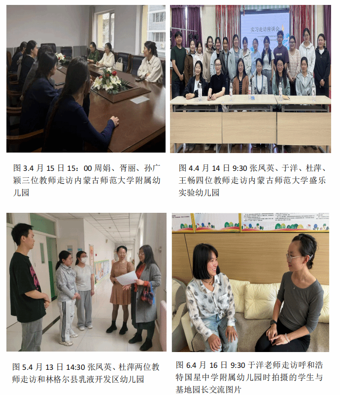 为掌握实习动态、加强园校协作、强化过程管理,帮助实习生解决实际困难、提升实践能力,4月13日—17日,教育学院学前教育系组织全体指导教师,分7组开展为期一周的实习走访,覆盖内蒙古自治区党委政府机关幼儿园各分园、内蒙古师范大学附属幼儿园、内蒙古师大盛乐实验幼儿园等多家单位。